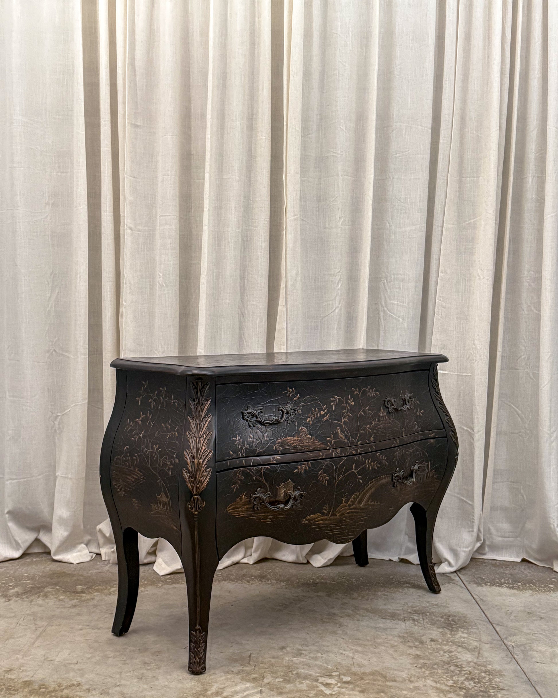 Bombe commode in black lacquer, featuring two drawers hand-painted in Chinoiserie-style scenery and finished with gilt bronze mounts. The curving silhouette emphasizes the sculptural quality of the form, balanced by intricate surface decoration.