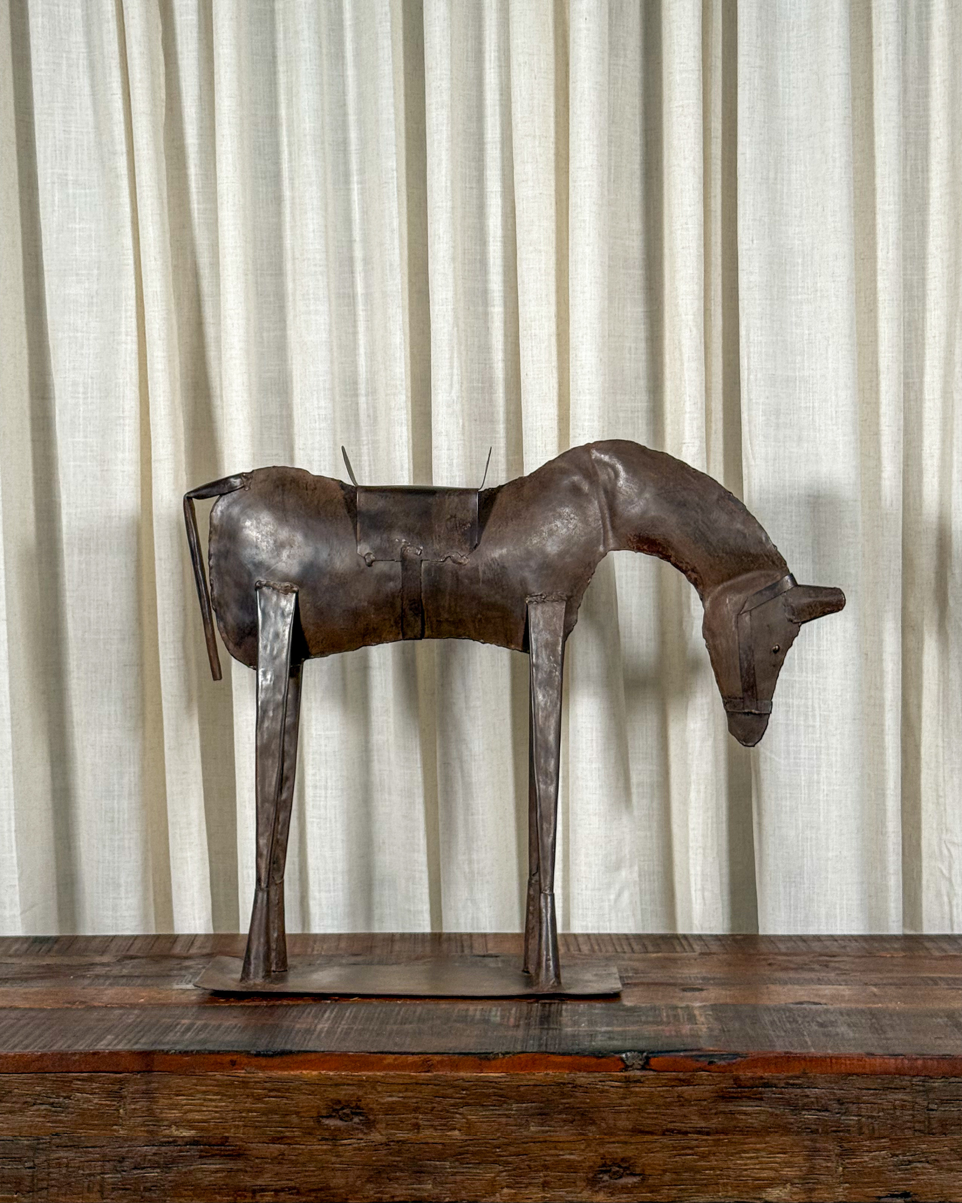 Vintage metal horse sculpture with a stylized, abstracted form. The figure bridges folk art sensibility and Brutalist influence, its pared-down contours and dark patinated surface emphasizing weight and presence.