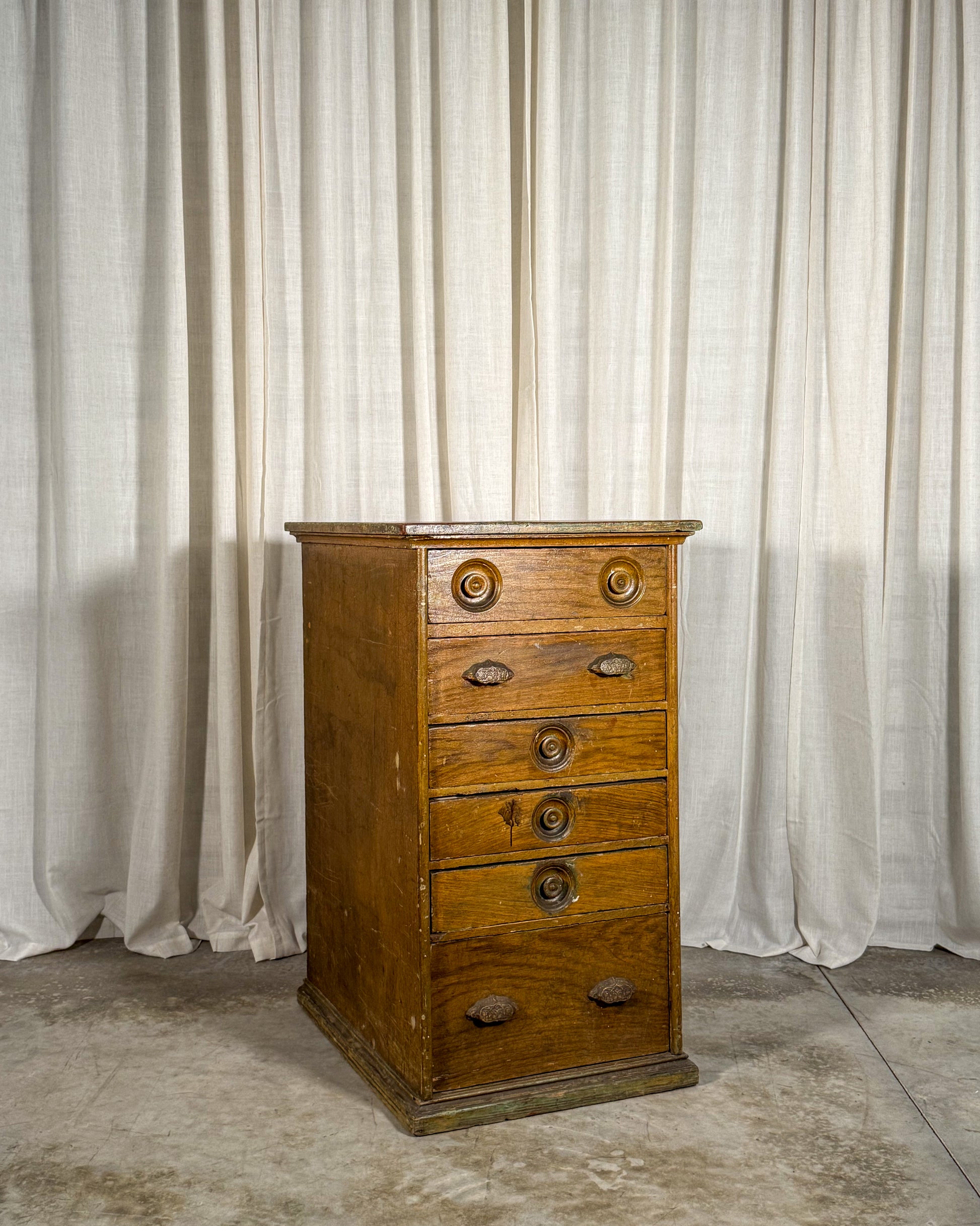 Tall, narrow oak apothecary-style cabinet with six working drawers, each fitted with varied hardware and decorative whimsical detailing. Retains its original finish with a heavy patina, likely circa 1930s.