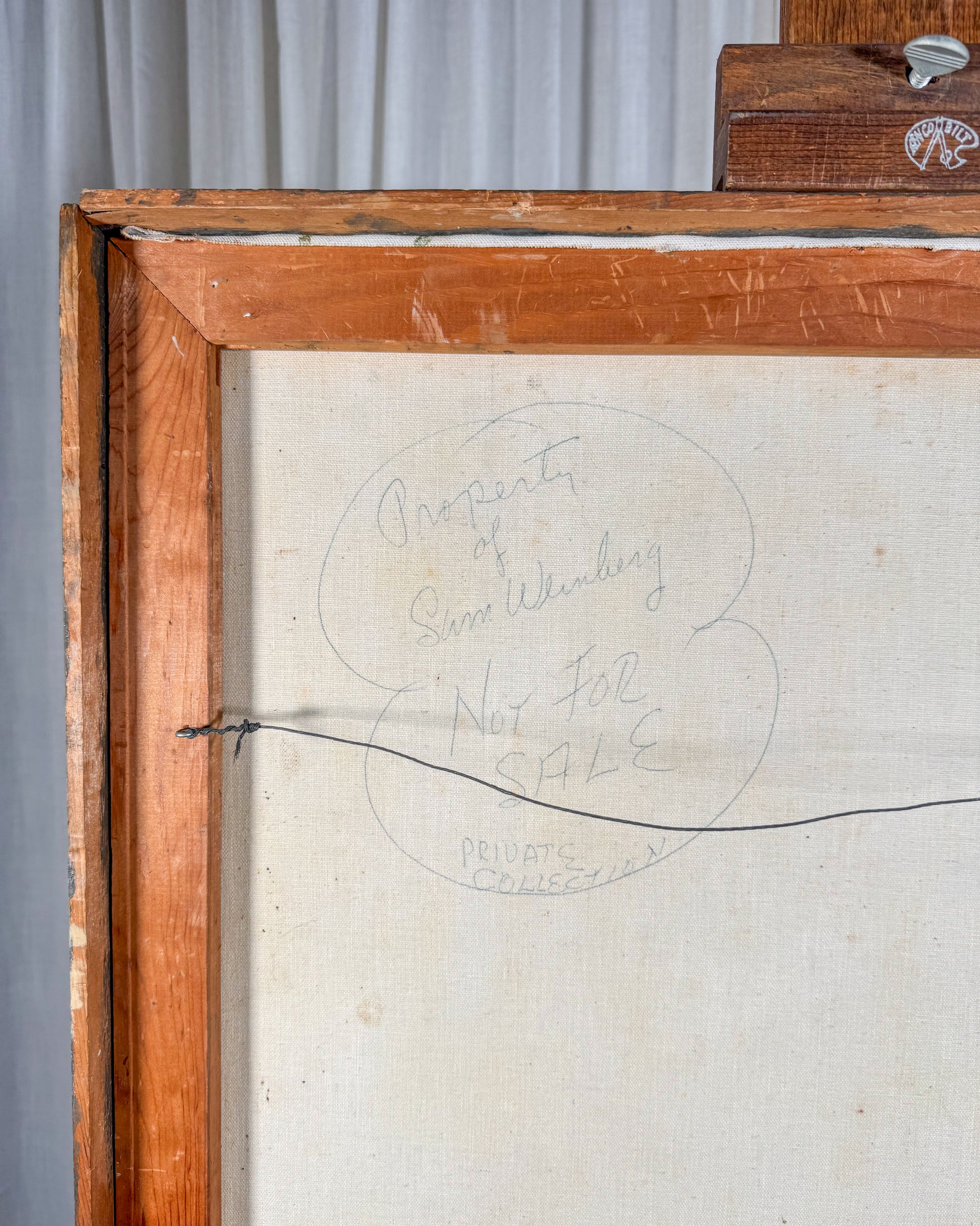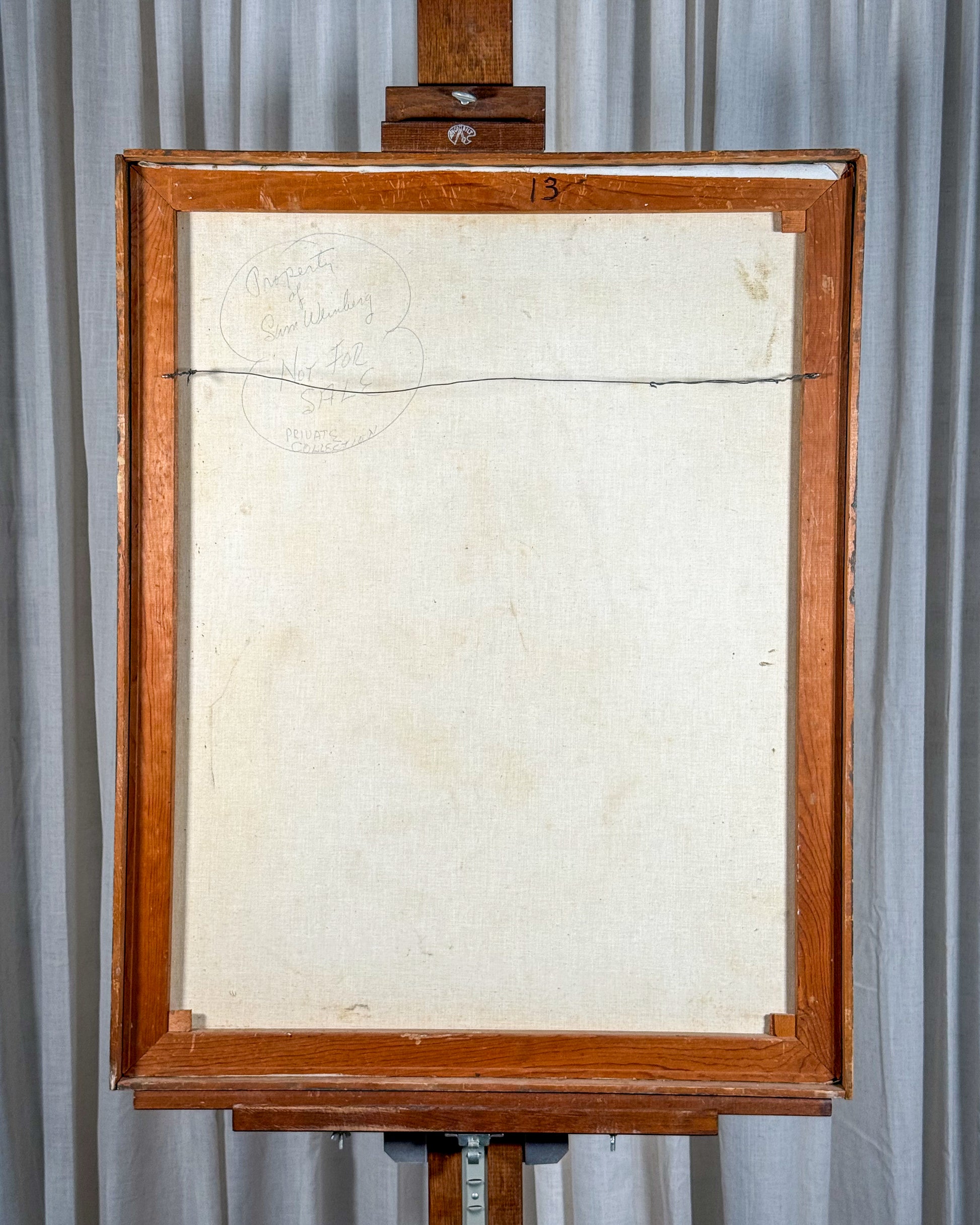 Large framed portrait painting, seated school age boy in red shirt and cap with newspaper delivery bag. Features a range of brush strokes in vibrant colors with crazing occurring in places across the canvas.