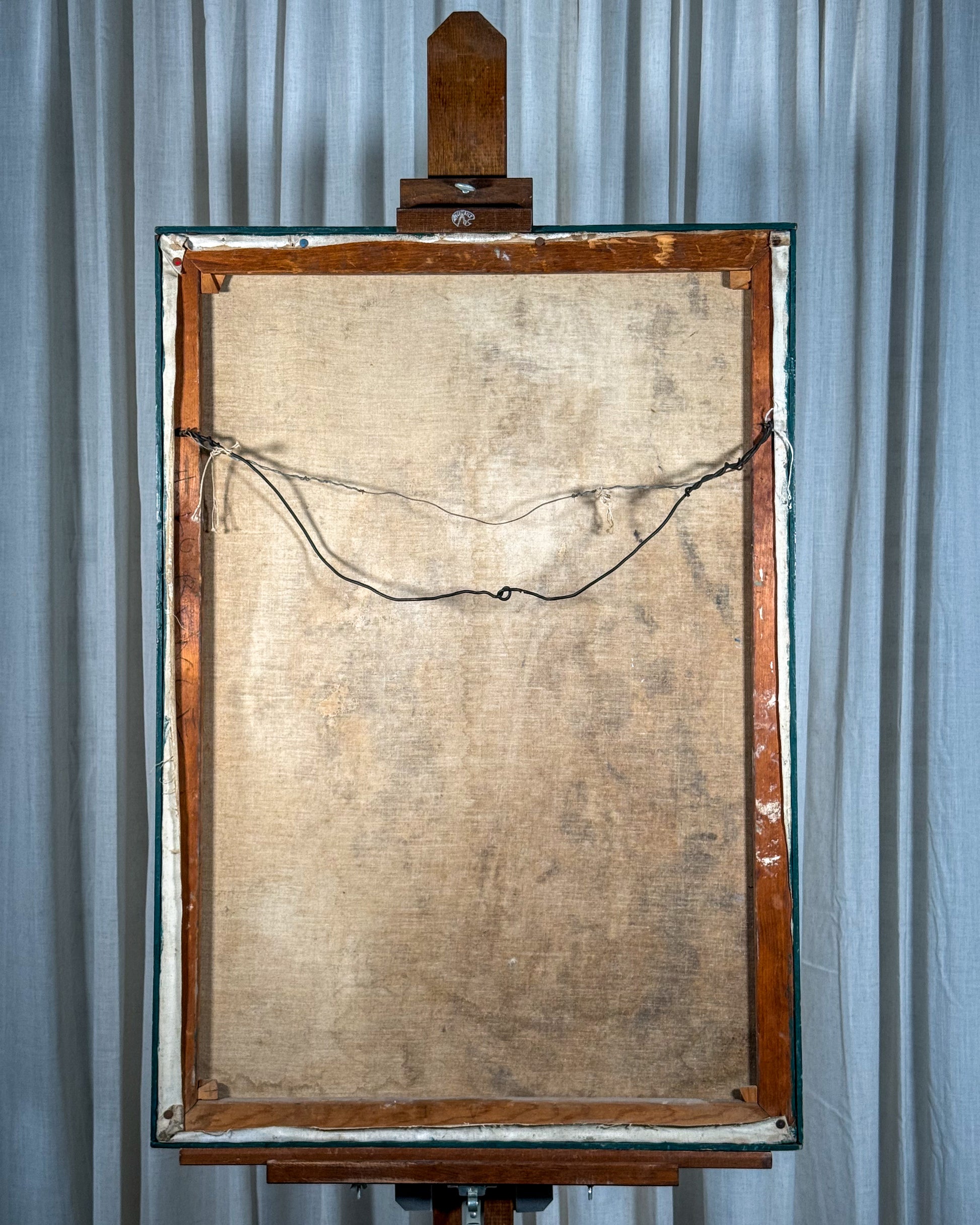 Large framed impressionistic portrait of an elderly man seated with a cane, wearing a baseball cap. Executed in muted tones with expressive brushwork, the surface shows areas of craquelure and light wear as well as light wear to the frame consistent with age.