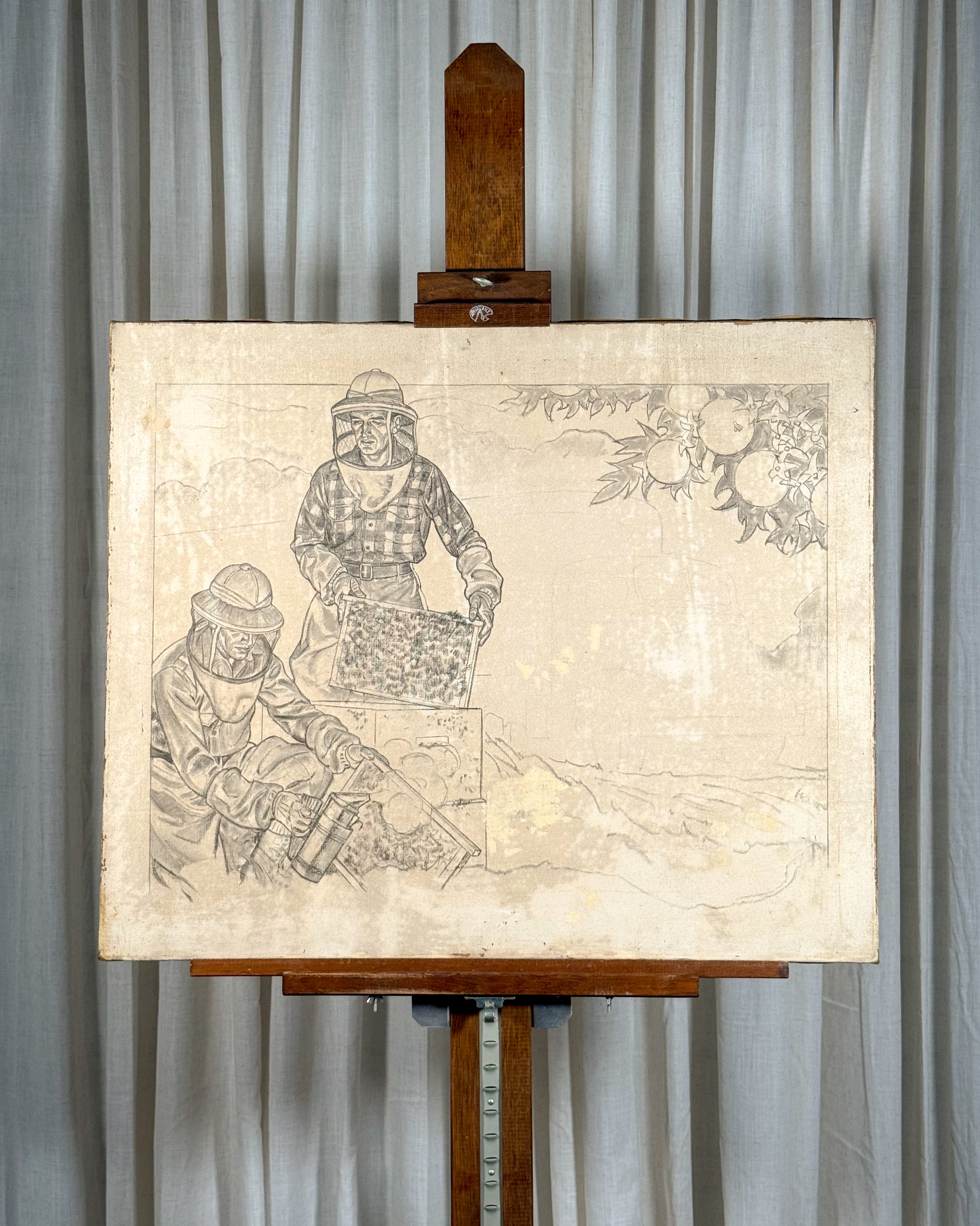 Large canvas depicting two beekeepers tending hives, likely within an orchard setting. The work appears to be an unfinished study, combining detailed areas with visible pencil underdrawings, including a faint outline of a truck and surrounding elements.